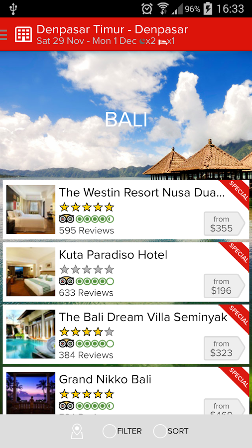 • The hotel features. During my Bali moment, I also checked hotels for the same time. The main thing I loved about the hotel search was the provided maps. As I have been to Bali a few times, I could easily see where the specific hotel was located, compared to my ideal area. It was very beneficial.